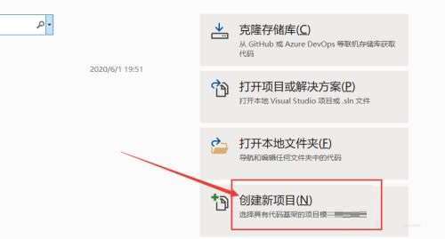 打开Visual Studio 2019后,点击“创建新项目”(如图所示)。
