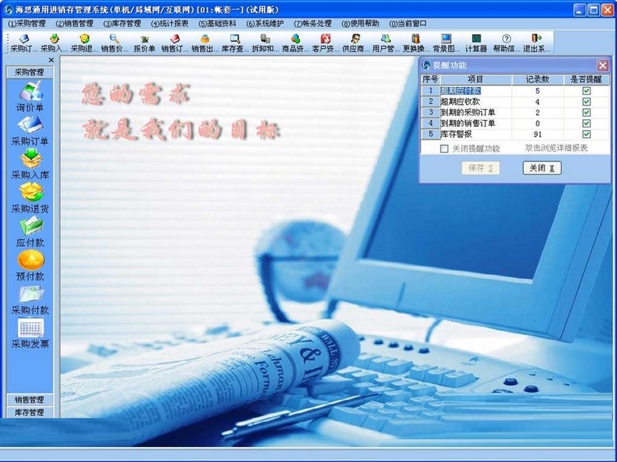 海思通用进销存管理系统试用版是一款界面清晰、使用流畅、专业实用的进销存管理软件,海思通用进销存管理系统试用版能够帮助用户进行采购发票和销售发票管理,同时海思通用进销存管理系统官方版还支持互联网远程连接异地使用,支持前台POS,使用起来非常的简单。