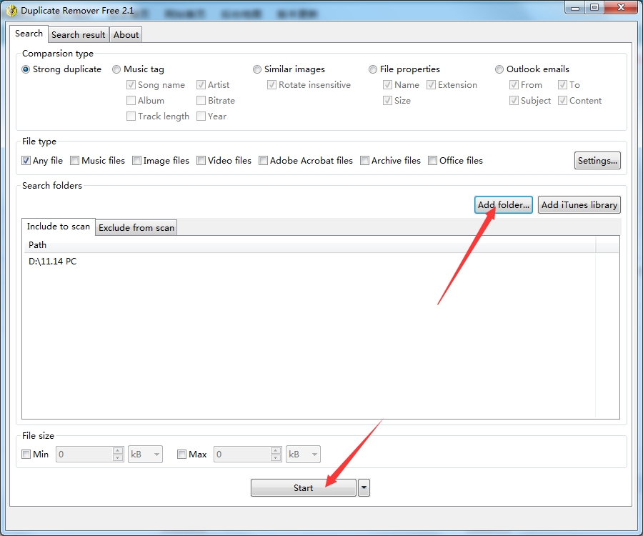 启动程序后,指定要在其中搜索重复项的文件夹或磁盘,然后单击“开始”按钮。