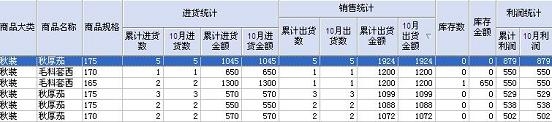 选择按月查询后按“查询”即可看到下图,从下图可以清晰的看出各种商品10月份的进货记录,销售记录,库存数,库存进金额和销售利润。