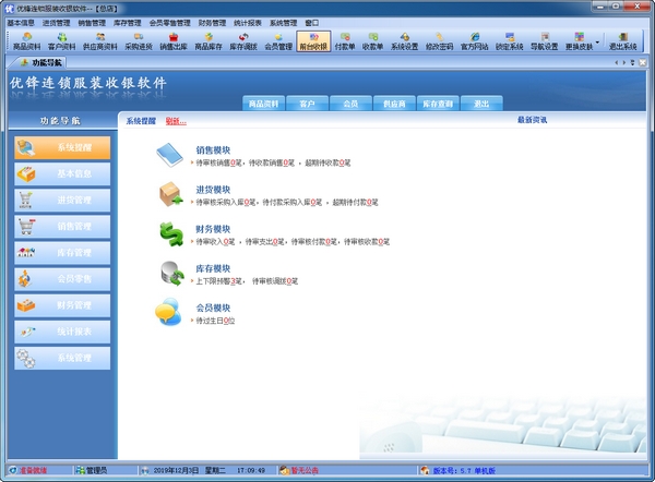 优锋连锁服装收银软件最新版是一款专门为服装店精心打造的管理软件,优锋连锁服装收银软件最新版为大家提供了系统提醒,基本信息,进货管理,会员零售,财务管理,系统管理几个功能模块。通过优锋连锁服装收银软件官方版可以帮助管理者轻松快捷的了解各个门店的具体信息和业绩状况。
