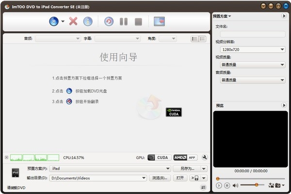 ImTOO DVD to iPad Converter最新版支持将DVD转换为不同分辨率的iPad H.264、MPEG-4、MP4视频(1280*720、720*480、640*480)。