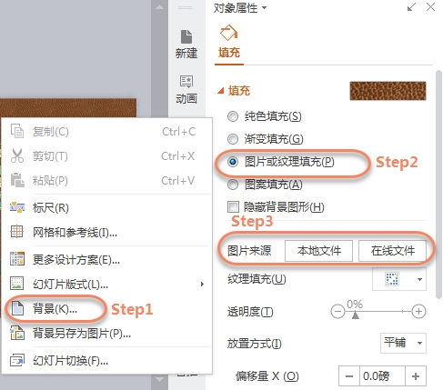 一、在页面上点击鼠标右键进入”背景”,在右侧窗格内,填充效果选择“图片或纹理填充”,选择本地文件后,再点击“全部应用”。