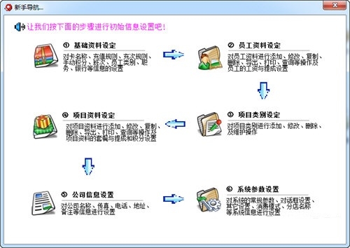 1、基础资料设立:对卡名称、充值规则、充次规则、手动积分、班次、员工类别、职务、银行等信息的设置