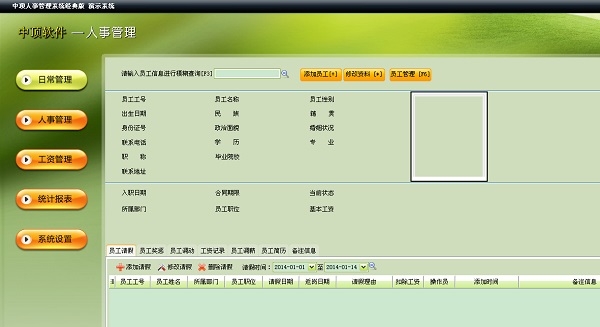 13.支持工作经历管理、考勤、员工培训、员工离职、奖惩管理等
