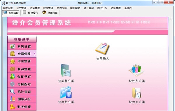 婚介会员管理系统官方版是一款婚介会员管理软件。婚介会员管理系统官方版包含了系统设置、会员管理、约见管理、联谊管理、合作伙伴、数据报表、单位性质、户口情况、合作伙伴、约见查看、客户信息管理等主要功能模块。婚介会员管理系统可以随时备份系统数据。