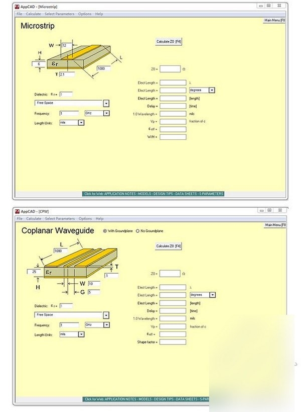 4、计算微带线(Microstrip)和共面波导(Coplanar Waveguide)特性阻抗的步骤与带状线的类似,具体界面分别如下: