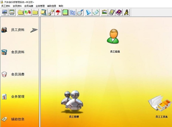 员工资料、会员资料、会员消费、业务管理、辅助信息五大模块。其中以会员资料和消费资料为主模块,规范的业务管理,实现了系统的全面化管理,是汽车俱乐部管理人员的得力助手。