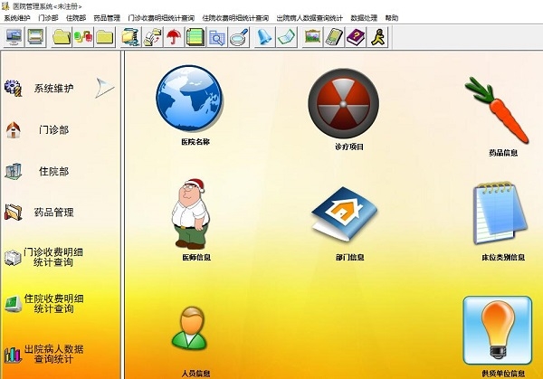系统维护包括:门诊收费信息、经办人信息、医师信息、科室信息、住院费用信息、药品库、期间参数设置六项,此项是系统的基础数据,在使用系统前应先输入这些信息。