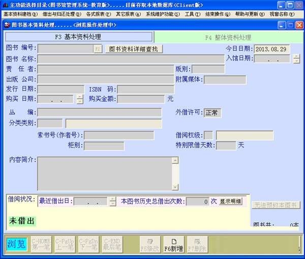 一个界面就可以编目完成书籍的基本资料,并可查得该书的借阅明细以及当前是否借出状态。