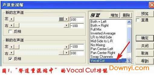 2 、打开音频后选择“效果”→“波形振幅”→“声道重混缩”,在打开的窗口中选择“预置”里面的“ vocal cut ”见(图 1 ),保持对话框上的默认设置,点“确定”按钮。经过 ce 处理后,就得到了《命中注定》这首歌的伴奏音乐了。