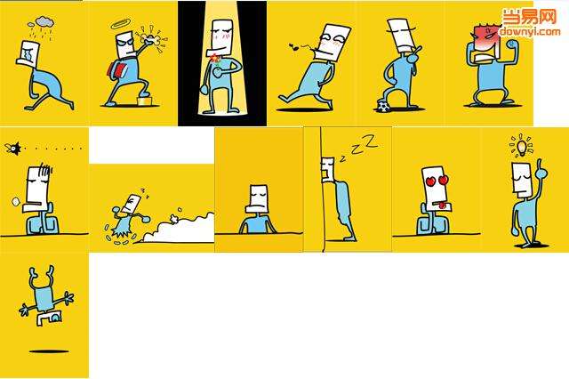 表情有:一个蓝衣服,方头的小人,表情有:雨中哭着跑,夹红书拿骨头,聚光灯下,跑,踩球说no,怒,乌鸦飞过,狂跑,惊,贴墙睡觉,色,站着想办法,掉下载到土里。