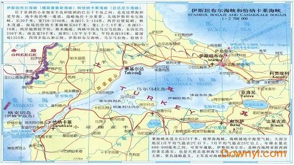 恰纳卡莱海峡地图高清版是一款非常清晰的海峡地图,地图制作的比例为1:2700000,海峡的地理位置、周边的所有国家和地区全部清楚的标识出来,同时这款高清大图还配有相关的文字说明。有需要的朋友欢迎来下载体验!
