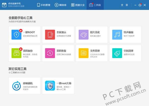 在本站下载解压后,进行安装,手机打开USB调试功能,然后和电脑连接,软件会自动识别,连接成功后,点击右下角工具箱,然后点击一键root就可以进行获取权限了。是不是非常简单啊。