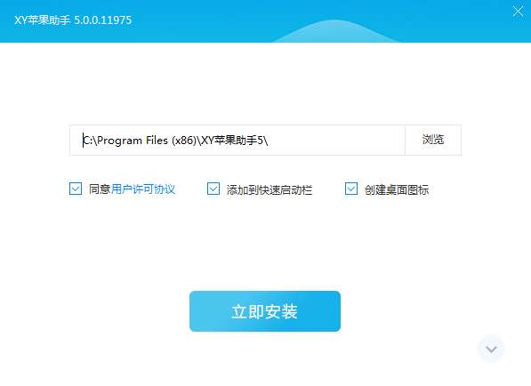 2、或者您可以点击【自定义安装】,在打开的选项安装位置窗口中,您可以点击【浏览】在打开窗口中,您可以自行选择XY苹果助手安装位置,选择完成后您可以自行勾选添加快捷方式和快速启动栏图标,然后点击【立即安装】。