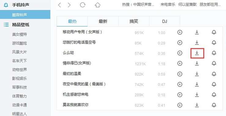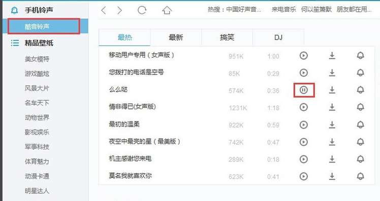2、点击左侧的【酷音铃声】,然后您可以先试听音乐。