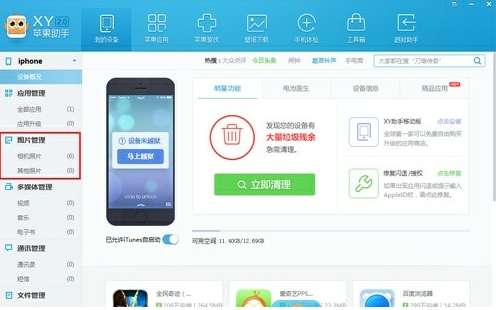 XY苹果助手可用户清理手机垃圾,帮助找出没用少用的大文件,无损处理手机照片。为您的设备腾出50%以上的空间;