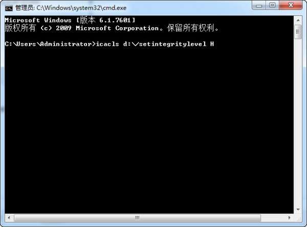 2、输入icacls d: /setintegritylevel H 后回车。d:是路径,比如你要运行的程序在 E:软件下载小软件 下,那么这个命令是 icacls E:软件下载小软件 /setintegritylevel H,还不可以的话,再运行一下icacls E: /setintegritylevel H,等到显示成功处理文件,就可以了。
