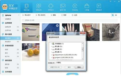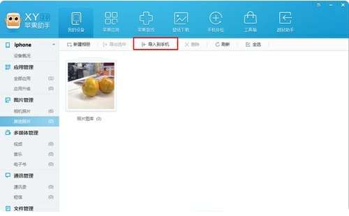 1、使用USB连接线连接iPhone与电脑,在XY苹果助手识别到您的iPhone之后,选择左边“图片管理”这个分类。在这里可以看到自己手机中的所有照片及图片。并可以对它们进行管理