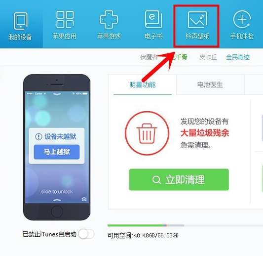 1、打开XY苹果助手后点击【铃声壁纸】。