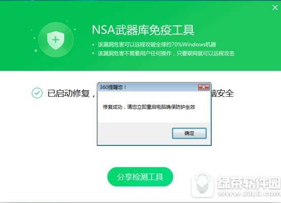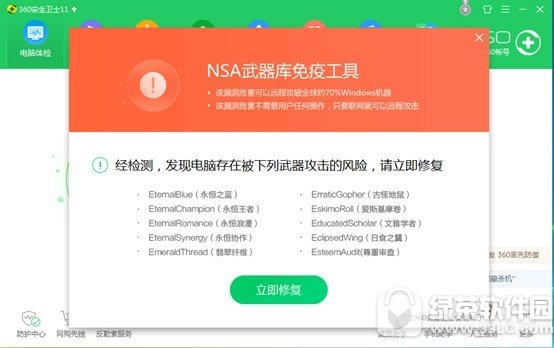 四、360安全卫士【离线救灾版】的NSA武器库免疫工具会自动运行,并检测您的电脑是否存在漏洞。