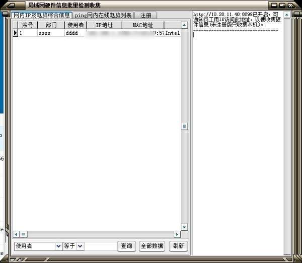 局域网硬件信息批量检测工具官方版运行之后,作为一个web服务,网管可以通知本单位内网的用户,访问该web服务。用户访问之后产生本机的硬件信息(包括IP地址、MAC地址、品牌机序列号、BIOS号、CPU、主板、内存、硬盘、显卡以及操作系统),并提供用户的姓名、部门、电话号码、资产编号,然后提交。提交之后,网管便收集到该用户的电脑硬件信息以及部门和其个人信息。当每个用户都提交之后,则本单位的电脑硬件信息便生成了。这样统计方便快捷。