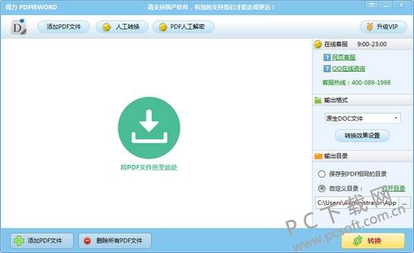 1、首先在本站下载安装好得力pdf转word转换器后,我们可以在桌面找到软件的快捷方式,鼠标双击快捷方式就可以进入软件主界面,在界面上有添加PDF文件、人工转换、PDF人工解密功能选项,在界面右侧还有输出格式、输出目录等设置。我们需要先将输出的格式(使用默认的格式就可以)、输出目录设置完毕,输出的目录你可以选择保存到PDF相同的目录或者自定义目录,选择合适的位置即可。