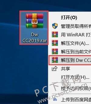 1、首先从PC下载网下载安装包,然后右击安装包选择“解压到Dw CC2019”。