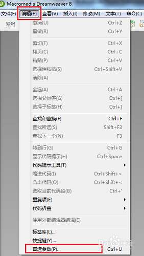 1、打开Dreamweaver,点击上方工具栏中的“编辑”,下拉中选择“首选参数”。