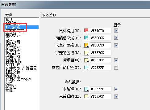 2、在弹出的“首选参数”窗口中,点击左侧“标记色彩”,把“显示”列打上勾。