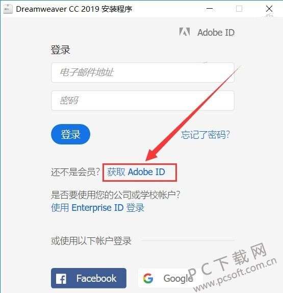 4、有账户的用户可以直接登录,没有账号的用户点击“获取Adobe ID”。