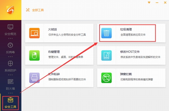 1.打开火绒杀毒软件,点击安全工具,再点击垃圾清理。