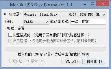 Martik USB Disk Formatter 是一个绿色免费的U盘格式化工具,它可以将U盘快速格式化为NTFS格式,可用减少格式化的时间。并且支持NTFS压缩功能,可以获取更多的可以空间。