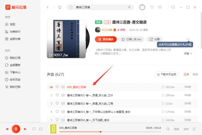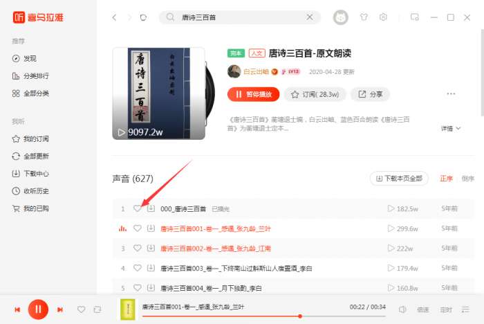 3、收听功能:用户可以在线播放并收听喜马拉雅网的任意一条声音和个人电台,包括自己关注的个人电台,或通过搜索找到的热门声音。收听不设限制。