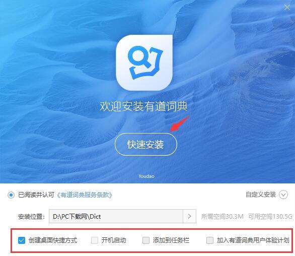 4、根据需要勾选创建桌面快捷方式、开机启动、添加到任务栏、加入有道词典用户体验计划等附加任务,点击“快速安装”开始安装