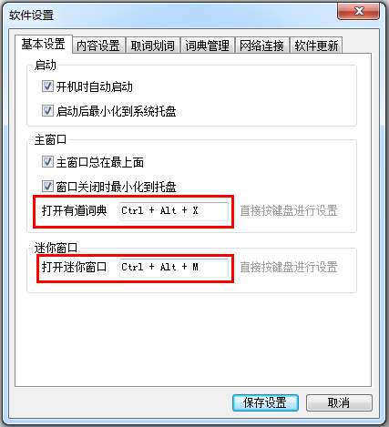 1、“打开有道词典”、“打开迷你窗口”快捷键的更改,在软件设置—基本设置中更改,如图: