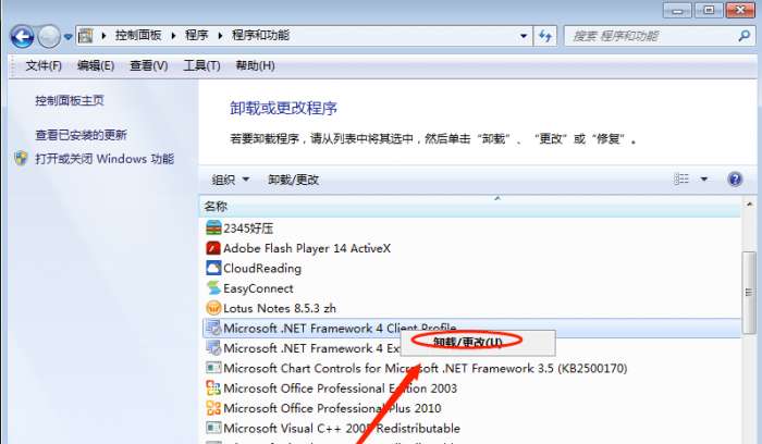 3、之后在卸载或更改程序列表总,找到需要卸载的.net framwork,选中该项,然后使用鼠标右键单击,并在右键菜单中选择“卸载、更改”选项。