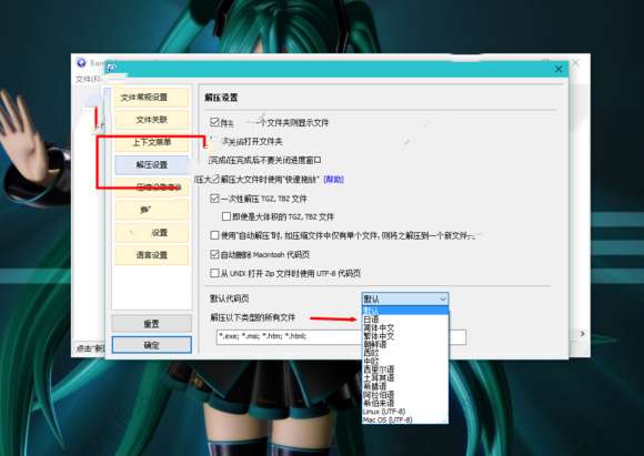 2)点击解压设置在默认代码页哪里选择对应的语言