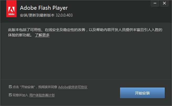 3.双击打开,进入Adobe Flash Player软件界面,点击开始安装