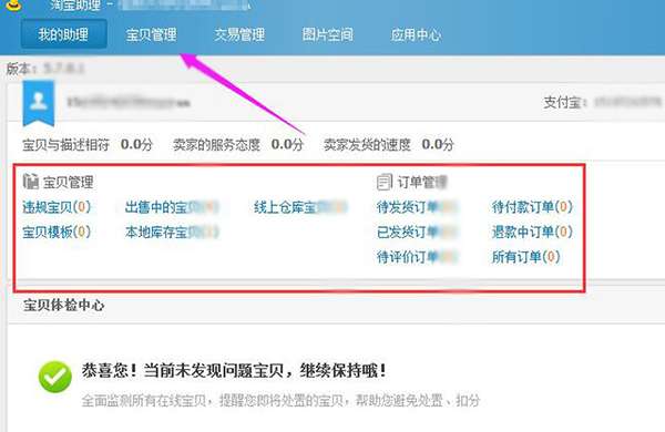 2、进入我的助理页面,可以看到正在出售中的宝贝,库存宝贝以及订单管理状态,点击第二个宝贝管理