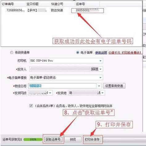 4、点击获取运单号,可以点击预览查看效果,确定之后点击打印并保存
