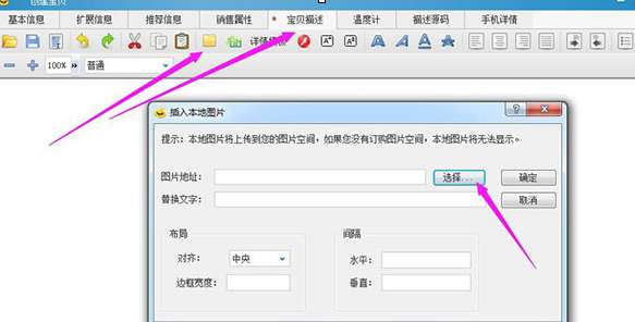 7、继续点击宝贝描述,点击上传本地图片或者图片空间图片,编辑好宝贝描述信息