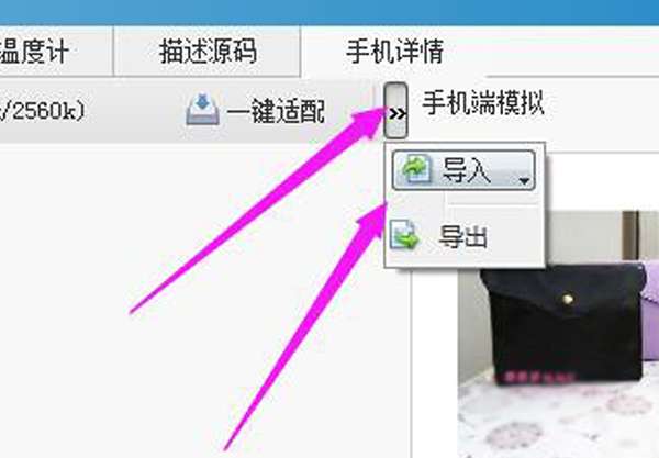 8、点击手机详情,点击一键适配后面的小符号,点击导入页面版详情
