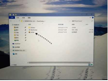 3、在安装好以后,在打开 U 盘启动盘打开 BootCamp 目录。然后双击打开 Setup 安装程序,这个是用来为 Windows10 安装 Mac 电脑的硬件驱动的。