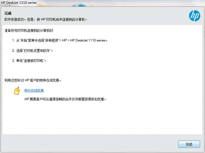 6.点击完成,惠普HP DeskJet 1112打印机驱动软件安装成功
