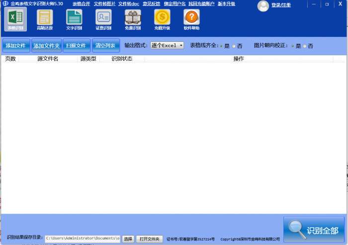 金鸣表格文字识别系统官方版是一款好用的文字识别工具。金鸣表格文字识别系统最新版可一次性提交数十张带表格的图片,程序将一并识别,直接识别为可编辑excel文件,方便编辑。金鸣表格文字识别系统官方版识别程序经人工智能深度学习,比传统的OCR软件识别率至少提高60%,识别率达99%以上。