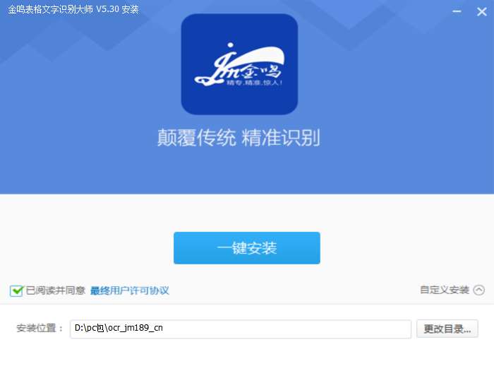 3.双击打开,进入金鸣表格文字识别系统软件界面,选择安装位置,点击一键安装