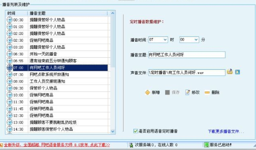 可以任意定义一天中的定时播音信息,可以精确到一天中的任意一分钟,您可以自己添加各类语音,对网吧组织各类活动及定时提醒非常有效。