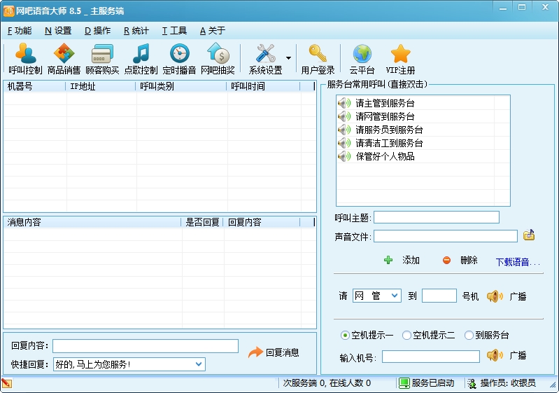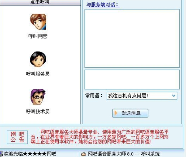 功能有呼叫网管,呼叫服务员,呼叫技术员,分别控制不同呼叫的时间间隔,有直接与主服务端文字对话功能,服务端亦有回复功能。