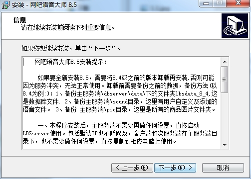 如果要全新安装8.5,需要将8.4或之前的版本卸载再安装,否则可能因为服务冲突,无法正常使用。卸载前需要备份之前的数据,备份方法(以8.4为例:):1、备份主服务端dbserverdata下的文件夹lbsdata_8_4,这是数据库文件. 2、备份主服务端sound目录,这里有用户自定义及添加的语音文件。 3、备份 主服务端pic目录,这里是所有的商品图片文件夹。